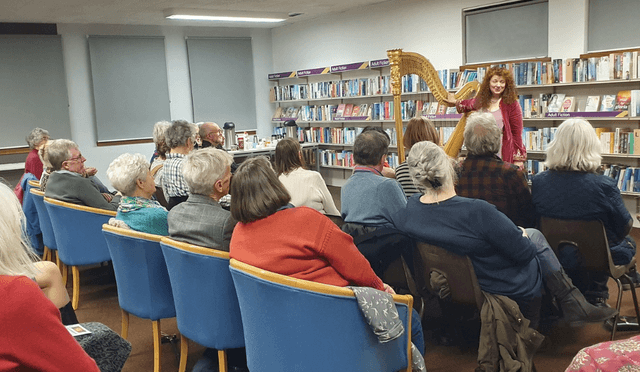 MN: We received funding from the Community Matters Fund to provide a programme of free events though the winter in a warm space as part of the national initiative to help to combat fuel poverty. Our aim was to fit in with our underlying ethos - provide a diverse programme where people could come and enjoy professional presenters for whom tickets would normally not be cheap, free of charge whilst at the same time saving on their own home heating. The programme looked to be entertaining and education, supporting health and well-being through being stimulating and fostering a sense of community. It has been phenomenally successful with capacity audiences enjoying a professional harp recital (see below), storytelling, lectures, games, film screenings and much more. As time has gone on, we have seen increased numbers of repeat bookings, leading to a building of our own community. People are clamouring for us to carry on after the grant funding finishes with more events in the summer.