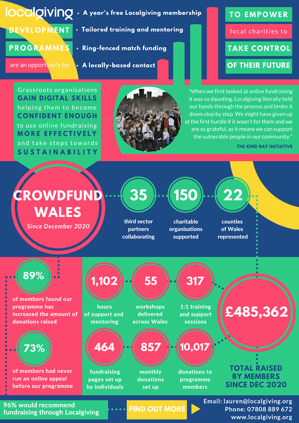 The programme was launched to support groups in Wales who were not taking advantage of the opportunities of online fundraising. Localgiving gave them the skills and confidence to engage with training and develop new skills that helped them to create new income streams. On joining the programme, Localgiving provided a free year of membership, access to Gift Aid and 1:1 support in how to fundraise online.