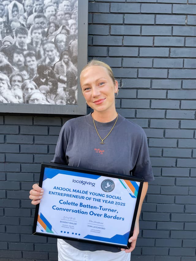 The winner of the Anjool Maldé Young Social Entrepreneur of the Year 2025, supported by Localgiving, is Colette Batten-Turner, CEO of Conversation Over Borders in Brighton, a CIC committed to supporting people fleeing war and persecution and ensuring they have a voice, and that the wider public can hear their stories. Their offering includes one-to-one online befriending, English classes, mental health support, digital access and inclusion.