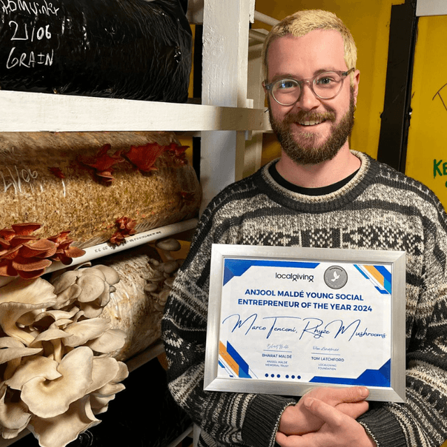 Our 2024 winner was Marco Tenconi, Director of Rhyze Mushrooms COOP CIC in Edinburgh, a community farm that seeks to solve some economic, environmental and social problems by growing highly nutritious oyster mushrooms. On picking up his award: "I'm grateful and proud to receive this generous award from the Anjool Maldé Memorial Trust in recognition of the work I have carried out through Rhyze Mushrooms. Growing food in our communities and valuing the hard work of food growers is increasingly important as extreme climatic change threatens our food supplies. We need radical and creative solutions to growing more food, more sustainably and it's exciting that our project has received recognition through this award."